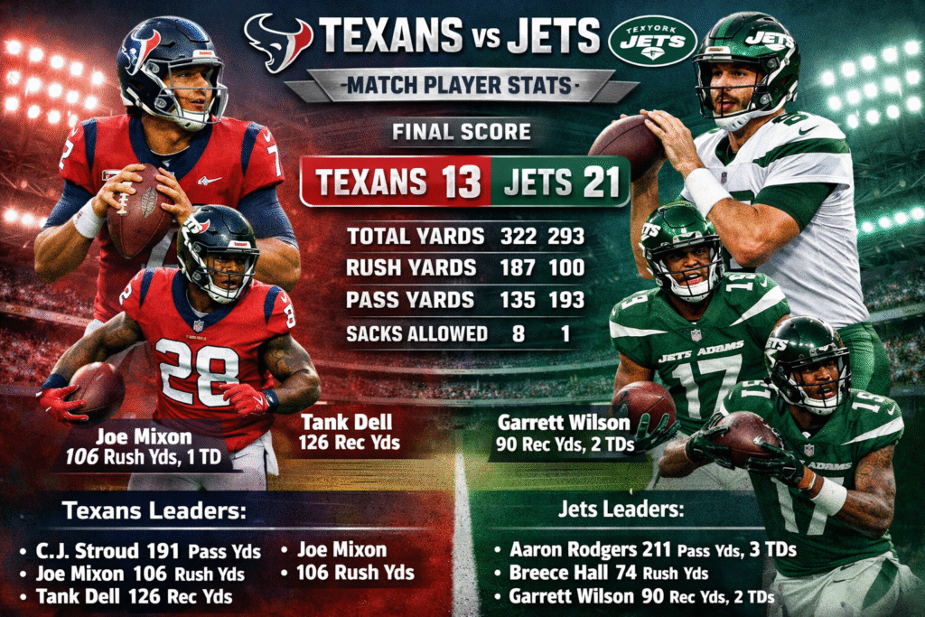 The match between the Houston Texans and the New York Jets was a strong and competitive NFL game that gave fans many exciting moments. Both teams showed effort on offense and defense, and several players delivered important performances. This article gives a clear and detailed look at the match player stats, key moments, and overall team performance.